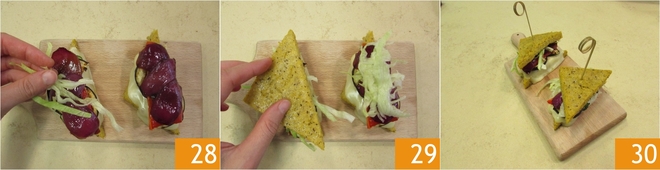 Finalmente, coloca también la lechuga cortada en juliana 28. Cierra con otra rebanada de polenta 29 y sella con un palillo de madera. Disfruta el sándwich de polenta con verduras y taleggio tibio o caliente 30.