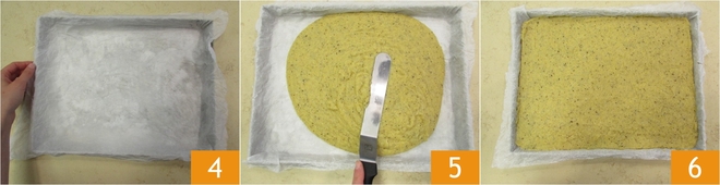 Cubre con papel de horno humedecido una bandeja de 30x40 4, vierte la polenta y nivélala con una espátula 5 6.
