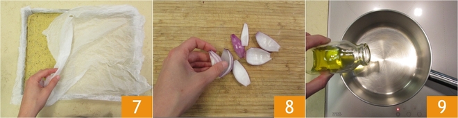 Cubre con otra hoja 7 y luego deja enfriar completamente en la nevera por al menos 1 hora. Limpia y corta las cebollas en gajos 8. En una cacerola de fondo grueso calienta un poco de aceite 9.