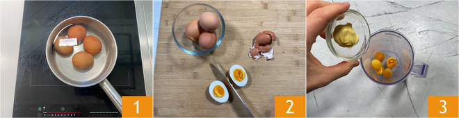 Para preparar la mayonesa japonesa, sumergid 4 huevos en una cacerola con agua fría; desde el momento en que empiece a hervir contad 10 minutos 1. Enfriadlos en agua fría, luego peladlos 2 y poned en el vaso de la batidora solo las yemas y la mostaza 3. Utilizad las claras en otras recetas.