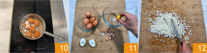 Pasad a la preparación del tamago sándwich. Sumergid 6 huevos en una cacerola con agua fría, llevad a ebullición y contad 10 minutos 10. Enfriad los huevos en agua fría y luego peladlos separando yemas y claras 11. Picad estas últimas de forma gruesa con un cuchillo 12.