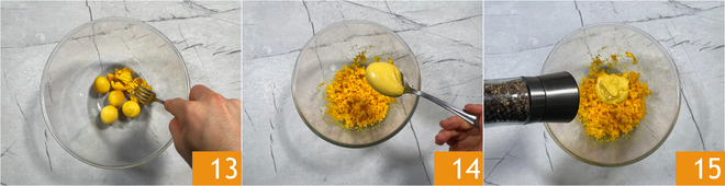 Aplastad las yemas en un bol 13 y añadid 100 gramos de mayonesa japonesa 14, sal y pimienta 15; mezclad bien.
