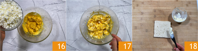 Incorporad las claras picadas 16 y mezclad de nuevo 17. Poned 10 gramos de mantequilla blanda sobre cada una de las 8 rebanadas de pan 18.