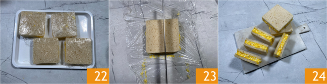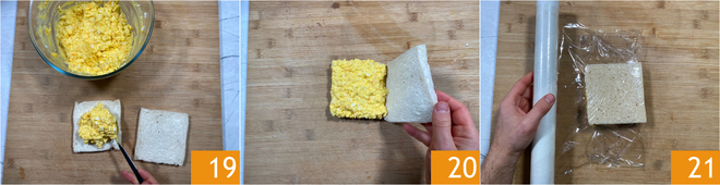 A continuación rellenad con abundante mezcla de huevo 19 y cerrad juntando con otra rebanada untada con mantequilla 20. Envolved el sándwich en film 21.