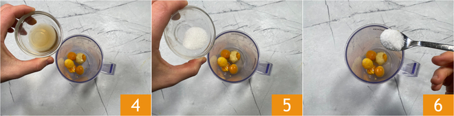 Añadid también el vinagre 4, el azúcar 5 y la sal 6.