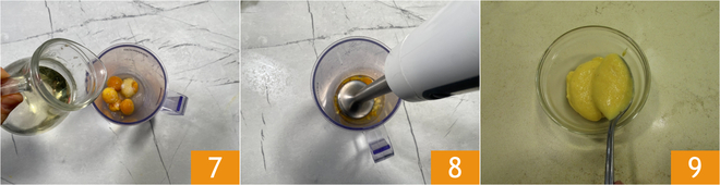 Por último, verted el aceite 7 y triturad con la batidora de mano 8 hasta obtener una salsa lisa y consistente. Trasladadla a un cuenco y conservadla en el frigorífico hasta su uso 9.