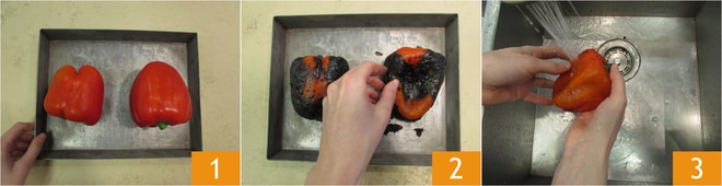 Para preparar vuestro sándwich tricolor empezad con los pimientos. Colocadlos en una bandeja de horno 1 y cocinadlos en horno estático precalentado a 200 grados durante unos 20 minutos (o hasta que se oscurezcan). Retiradlos del horno y con los dedos eliminad la parte oscura de la piel asada 2, luego enjuagad los residuos con agua en el fregadero 3.