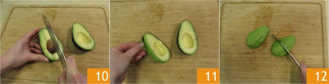 Extraed el hueso interno 10 y eliminad la piel 11. Cortadlo en rodajas finas 12 y reservadlo en un cuenco vertiendo encima el jugo del limón.
