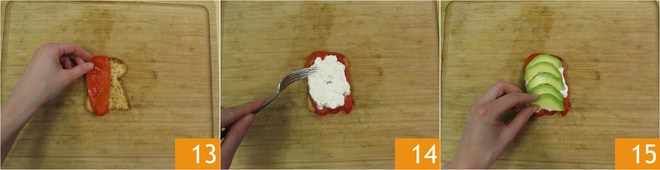 Ahora podéis componer vuestro sándwich: comenzad poniendo sobre una rebanada de pan dos rodajas de pimiento 13, ¼ de la stracciatella 14 y 5 rodajas de aguacate 15.