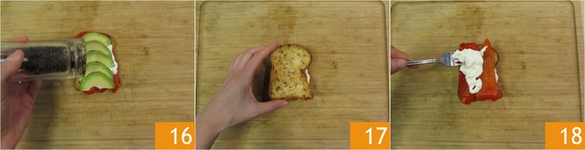 Condimentad con sal y pimienta 16, luego colocad encima otra rebanada de pan 17, continuad con una segunda capa de pimientos, stracciatella 18
