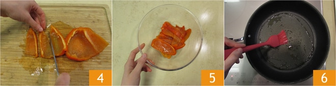 Eliminad la parte superior del pimiento, luego cortadlo por la mitad y después dividid cada mitad en tres partes 4. Reservad 5 y ocupáos del pan, untadlo con aceite y calentad una sartén antiadherente 6.