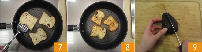 Tostad las rebanadas de pan por ambos lados 7, tomará pocos minutos 8, luego reservadlo caliente. Pon la stracciatella a escurrir en un colador. En este punto, tomad el aguacate y divididlo por la mitad a lo largo 9.