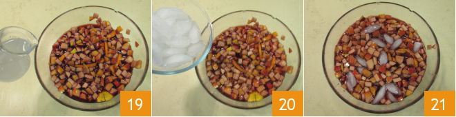 Transcurrido el tiempo de maceración, elimina la vaina de vainilla y las especias, luego añade la gaseosa 19 y el hielo 20. Da una última mezcla y tu sangría está lista para ser servida 21!