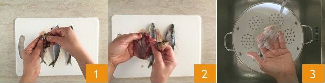 Para preparar las sardinas fritas, lo primero que debéis hacer es comenzar con la limpieza de las sardinas. Presionando ligeramente con los dedos, lograréis separar la cabeza sin esfuerzo 1, y junto con la cabeza podréis extraer fácilmente las vísceras. Una vez separada la cabeza y las vísceras, solo tendréis que abrirlas delicadamente con los dedos, abriendo los peces como un libro, de esta manera podréis extraer fácilmente las espinas 2. Pasad las sardinas limpias bajo agua corriente 3,