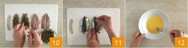 Rellenad la mitad de las sardinas con la mezcla preparada 10, luego cerradlas con las restantes para prepararlas en parejas de dos 11, el número de sardinas obtenidas puede variar según el tamaño. Batid los huevos en un plato hondo, salar ligeramente y mezclad con un tenedor 12, verted el pan rallado en otro plato.