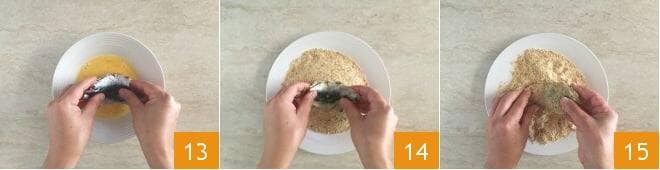 Pasad las sardinas primero por el huevo 13, luego por el pan rallado 14, cuando las paséis por el pan, presionad ligeramente para que se adhiera mejor 15.