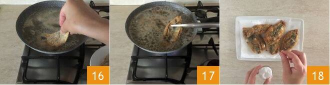 Verted el aceite en una sartén grande, calentadlo, y freíd las sardinas 16 cocinándolas durante unos 2 minutos por cada lado, o hasta que estén doradas. Escurrid las sardinas 17 y colocadlas sobre papel absorbente, luego ajustad la sal 18.