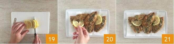 Cortad el limón en rodajas 19 y colocadlo junto a las sardinas fritas 20. Decorad con perejil picado y servid 21.