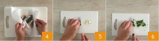 escurridlas y colocadlas sobre papel absorbente, secadlas delicadamente para que queden bien secas 4. En este punto, picad el ajo 5, el perejil 6,