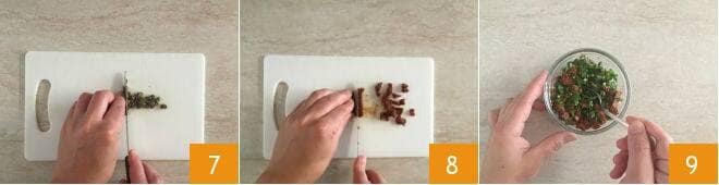 las alcaparras 7 y los tomates secos 8; verted todo en un bol y mezclad 9.