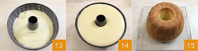 hasta llenarlo por la mitad 13, y dejad que fermente, en el horno apagado con la luz encendida, hasta que el savarin llegue al borde del molde, tomará aproximadamente 1 hora 14. Hornead en el horno estático precalentado a 180° durante 60 minutos. Desmoldad el savarin aún caliente y dejad que se enfríe sobre una rejilla 15.