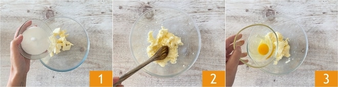 Para preparar la sbriciolada de manzanas, comienza con la masa. En un bol, coloca la mantequilla junto con el azúcar 1. Ablándala con una cuchara de madera hasta que quede cremosa 2. Añade el huevo 3 y mezcla hasta que esté bien incorporado.