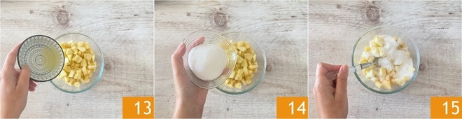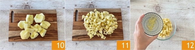 Prepara el relleno de manzanas y amaretti. Quita la piel de las manzanas, córtalas por la mitad, quita el corazón y luego córtalas en 4 gajos 10. De estos, saca dados de 1 cm 11. Transfiere los cubos de manzana a un bol y añade la ralladura de limón 12.