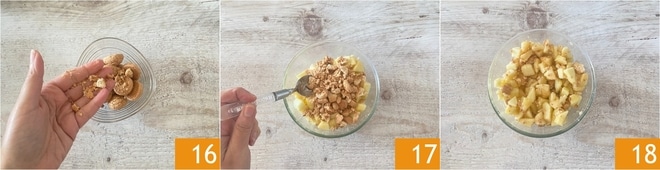 Tritura los amaretti toscamente con las manos 16 y añádelos a las manzanas 17. Mezcla bien 18.
