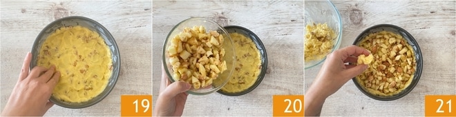 Unta con mantequilla y enharina un molde de tarta desmontable de 20 cm de diámetro. Pon ¾ de la masa en el fondo del molde, compactándola con las manos, de manera que cubra todo el fondo y suba por los bordes para contener el relleno 19. Vierte en su interior las manzanas con los amaretti 20, nivela y cubre con el restante de masa desmigajada 21.