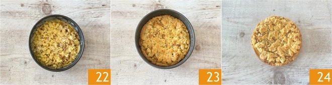 Intenta cubrir las manzanas completamente, sin presionar esta vez 22. Cocina la sbriciolada de manzanas en horno estático, precalentado a 180° durante unos 35 minutos. Sáquela 23 y déjala enfriar completamente antes de quitarla del molde 24 y servirla.
