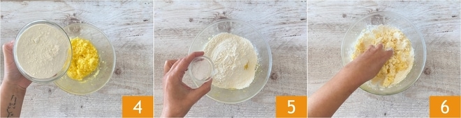 Incorpora la harina 00 previamente tamizada 4 y la levadura para dulces también tamizada 5. Amasa con la punta de los dedos 6, hasta obtener una mezcla desmigajada.
