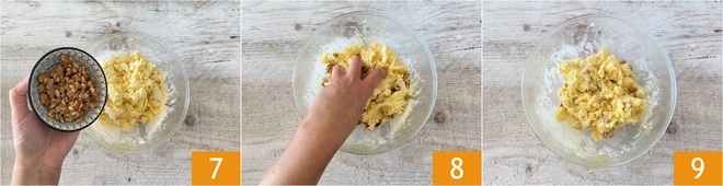 En este punto, añade también las nueces 7 y da otra amasada rápida 8, hasta integrar los ingredientes 9. Reserva en la nevera hasta su uso.