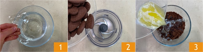 Para preparar la tarta desmenuzada sin cocción menta y chocolate, como primer paso pon a remojar la gelatina en hojas 1. Mientras tanto, derrite la mantequilla en un cazo y déjala templar. Pon las galletas en la batidora 2 y tritura hasta obtener una mezcla granulosa. Transfiere todo a un bol y añade la mantequilla derretida 3.