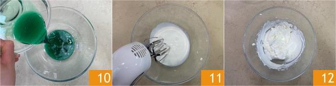 Une el resto del jarabe a temperatura ambiente 10, mezcla y deja enfriar. Mientras tanto, monta la nata 11 12.