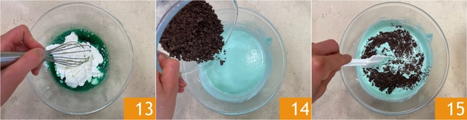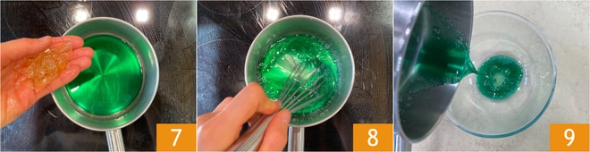 Mientras tanto, dedícate al relleno: toma 60 g del total del jarabe de menta y caliéntalo en un cazo, luego añade la gelatina en hojas bien escurrida 7. Mezcla y disuelve completamente 8. Vierte el jarabe en un bol 9.