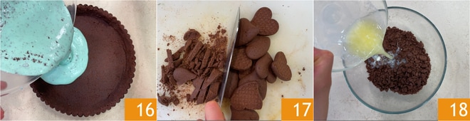 Recupera la base del frigorífico y vierte el relleno en el molde 16, luego vuelve a colocar en el frigorífico. Mientras tanto, prepárate para la cobertura: derrite la mantequilla en un cazo, tritura las galletas en la batidora 17 y únelas ambas en un bol 18.