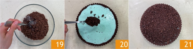 Mezcla 19 y cubre con la mezcla obtenida la superficie del relleno que aún estará blando 20. Deja que se endurezca en el frigorífico durante al menos 2 horas 21.
