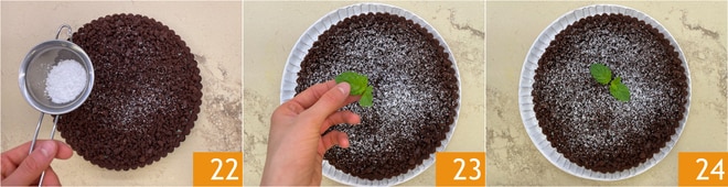 Desmolda la tarta en un plato para servir y decora con azúcar glas 22 y hojas de menta 23. ¡Tu tarta desmenuzada sin cocción menta y chocolate está lista para ser degustada 24!