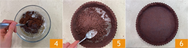Mezcla bien 4. Vierte dos tercios de la mezcla en un molde con fondo desmontable, de 22 cm de diámetro. Con esta cantidad realiza el borde 5, luego añade la parte restante para la base 6. Coloca en la nevera para que se endurezca durante 10-15 minutos.