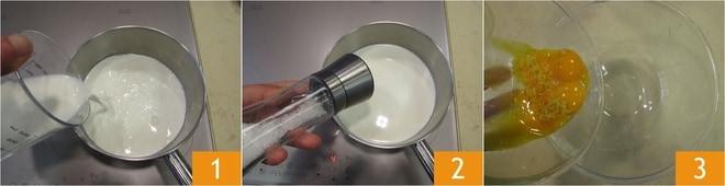 Para preparar la sbriciolata a la crema de limón, lo primero que hay que hacer es cortar la mantequilla en cubos y guardarla en el frigorífico: debe estar bien fría para la base. Mientras tanto, ocupaos de la crema. Calentad la leche 1, añadid una pizca de sal 2 y llevadla a punto de ebullición. Mientras tanto, en un bol, verted las yemas y la ralladura de limón 3.