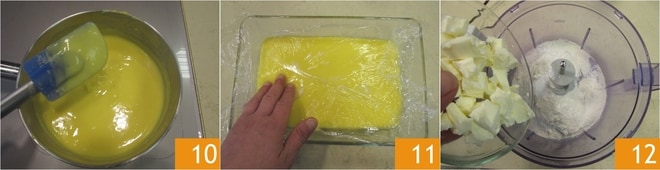 Una vez lista la crema 10 vertedla en una fuente y cubrid con film en contacto 11. Dejad enfriar a temperatura ambiente y luego llevad al frigorífico. Ahora ocupáos de la base: en la batidora verted la harina y la mantequilla muy fría 12.