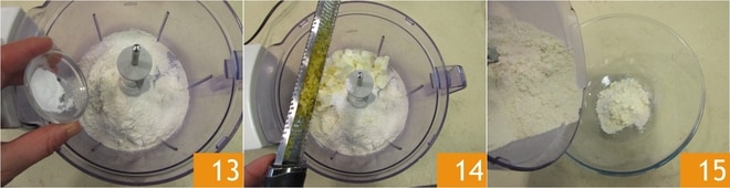 Una pizca de sal, la levadura 13 y la ralladura de un limón 14. Accionad la batidora para obtener una mezcla arenosa y vertedla en un bol grande 15.