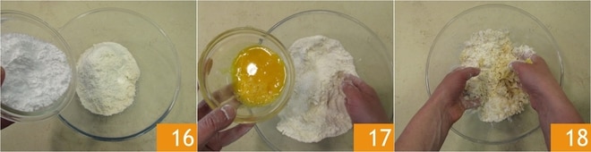 Agregad el azúcar glas 16, el huevo 17 y mezclad con las yemas de los dedos 18.