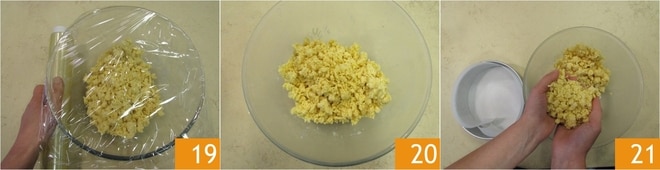 Trabajad justo el tiempo necesario para que se absorban los líquidos. Cubrid con film 19 y dejad enfriar en el frigorífico durante al menos 1 hora. Pasado el tiempo de enfriamiento de la base y de la crema, tomad la masa quebrada fría y con las manos desmenuzadla 20. Verted más de la mitad de la masa en el molde forrado con papel de horno de 20 cm de diámetro 21.