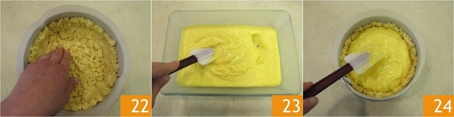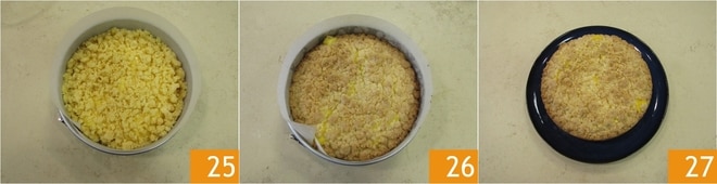 Con el resto de la masa quebrada, cubrid la superficie del molde 25. Cocinad en horno ya caliente durante unos 80 minutos, a 180° en la parte más baja del horno. Pasado el tiempo de cocción, sacad del horno y dejad enfriar 26. Una vez fría, desmoldad la sbriciolata a la crema de limón 27 y espolvoread con azúcar glas al gusto.