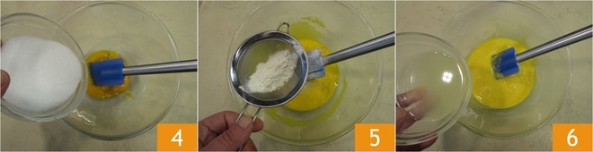 Añadid el azúcar y mezclad 4, incorporad también la harina tamizada 5 y el zumo filtrado del limón 6. Mezclad para obtener una mezcla homogénea y sin grumos.