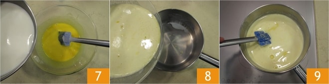 Ahora incorporad la leche caliente vertiéndola en 2-3 veces 7 y mezclad. Verted la mezcla en el cazo donde habéis calentado la leche 8 y llevad la crema a hervir, continuando a mezclar continuamente y cuidando de tocar bien el fondo de la olla 9. Cuando la crema empiece a espesarse, dejad cocinar durante unos 1-2 minutos.