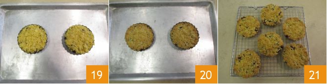 Colocadlas sobre una bandeja de horno 19 y hornead en horno estático precalentado a 180° durante 25 minutos en la bandeja inferior. Sacad las sbrisoline del horno 20 y dejadlas enfriar completamente antes de desmoldarlas y servirlas 21.