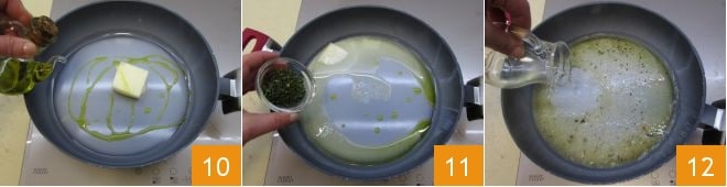 Después, tomad otra sartén antiadherente. Derretid a fuego lento la mantequilla con un hilo de aceite 10. Cuando la mantequilla se haya derretido, añadid la mezcla de romero y salvia 11. Añadid en este punto el vino blanco para desglasar 12.