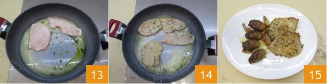 Ponéis entonces vuestros escalopines a cocinar en la sartén 13. Dadles la vuelta de vez en cuando para permitir una cocción uniforme 14. Dejad cocinar durante 2-3 minutos para que se doren bien. Luego emplatad acompañando con las chalotas caramelizadas. ¡Vuestros escalopines al romero y salvia con chalotas caramelizadas están ahora listos para servir y disfrutar aún calientes 15!